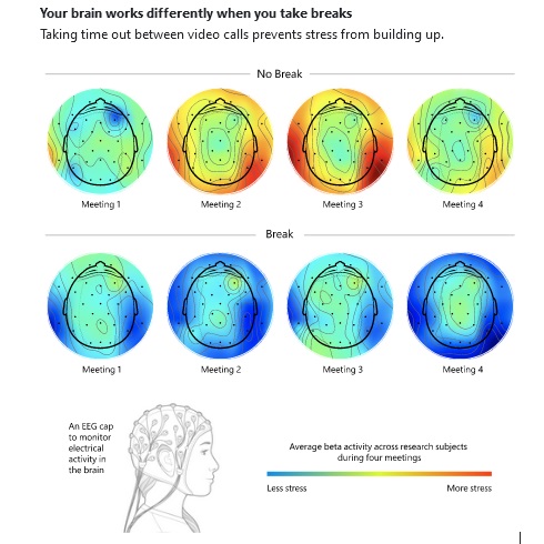 مایکل بوهان، مدیر ارشد گروه مهندسی فاکتورهای انسانی مایکروسافت که ناظر بر این پروژه بود بیان کرد که «تحقیقات ما نشان میدهد که وقفههای استراحتی مهم هستند، نه فقط برای اینکه ما در پایان روز کمتر خسته باشیم، بلکه در واقع توانایی ما برای تمرکز و مشارکت در آن جلسات را بهبود میبخشد. تیم آنها از ۱۴ نفر خواستند در جلسات ویدیویی شرکت کنند در حالی که از تجهیزات الکتروانسفالوگرام (EEG) استفاده میکردند. داوطلبان هر کدام در دو جلسه مختلف شرکت کردند. در یک روز آنها در چهار جلسه نیم ساعته پشت سر هم شرکت کردند. در یک روز دیگر، چهار جلسه نیم ساعته با وقفه های ۱۰ دقیقه ای همراه بود. شرکتکنندگان بهجای رفتن عجولانه از یک جلسه به جلسه دیگر، در طول وقفهها با اپلیکیشن Headspace مدیتیشن میکردند.