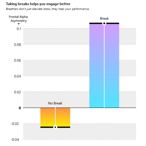 بدون وقفه استراحتی، فعالیت امواج بتا در مغز می تواند در ابتدا و انتهای جلسات به شدت افزایش یابد که نشان دهنده افزایش استرس است. استراحت نه تنها از این افزایش ها جلوگیری می کند، بلکه باعث کاهش فعالیت بتا می شود که با استرس کمتر مرتبط است.