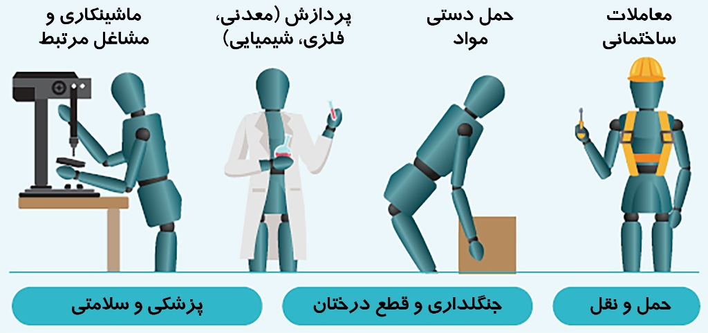 تقریباً تمامی مشاغل در میان کارگران آسیبدیده نسبت به جمعیت عمومی در معرض خطر بالای آسیبهای مرتبط با مواد مخدر قرار داشتند (به جز مشاغل آموزشی و مرتبط با آن). مشاغل و فعالیتهایی که در بالاترین خطر قرار داشتند شامل: