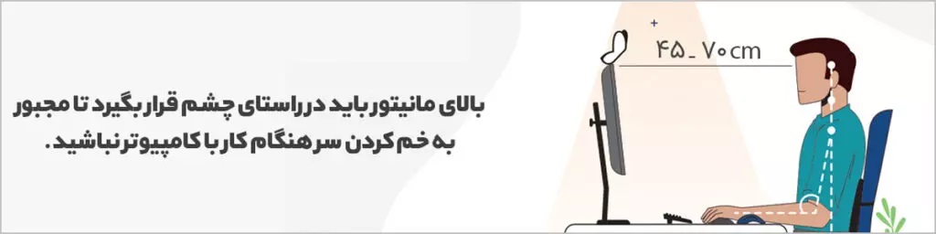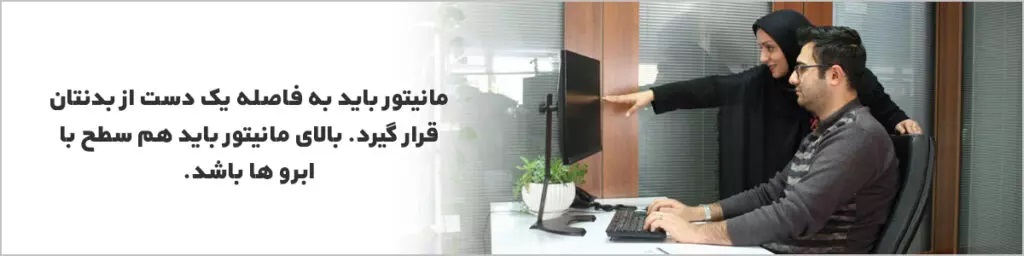 مانیتور باید به فاصله یک دست از بدنتان قرار گیرد. بالای مانیتور باید هم سطح با ابروها باشد و پایین مانیتور کمی به بالا کج شده باشد در این صورت پلک تا اندازهای کره چشم را میپوشاند و پلک زدن، چشم را مرطوب نگه میدارد.