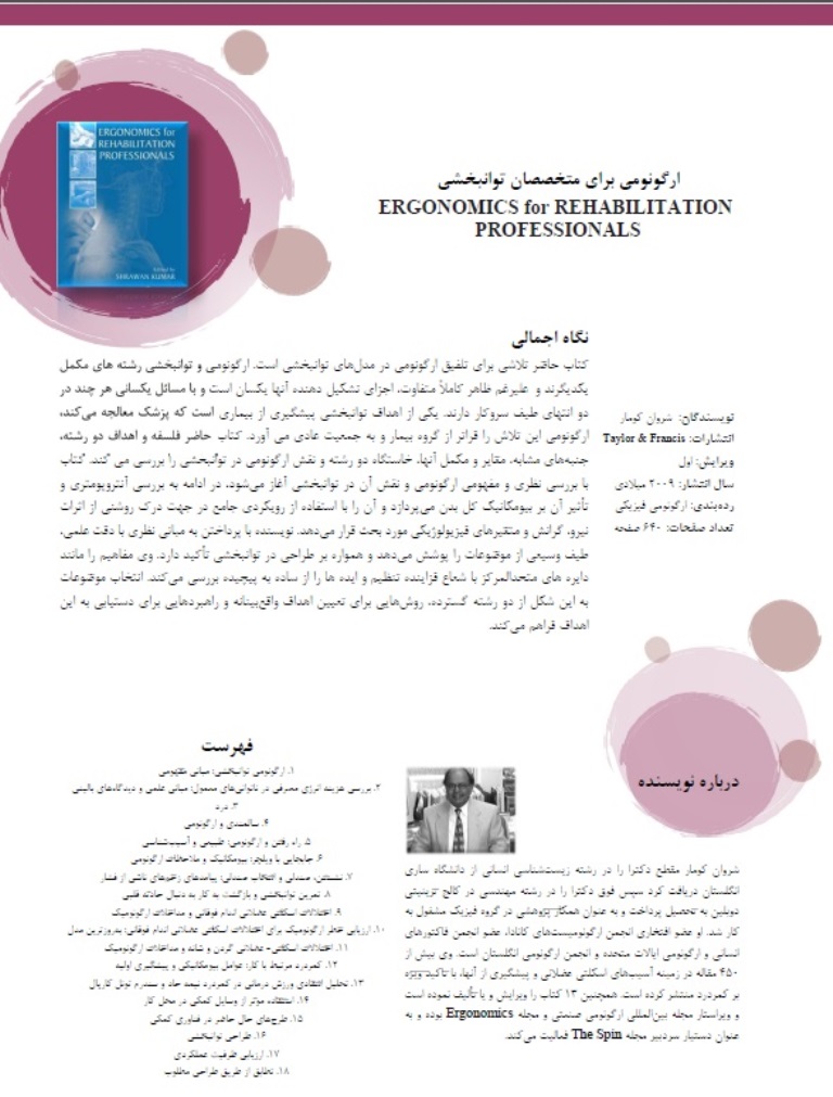 کتاب «ارگونومی برای متخصصان توانبخشی» تلاشی برای تلفیق ارگونومی در مدلهای توانبخشی است. این کتاب فلسفه و اهداف دو رشته، جنبههای مشابه، مغایر و مکمل آنها، خاستگاه دو رشته و نقش ارگونومی در توانبخشی را بررسی میکند.